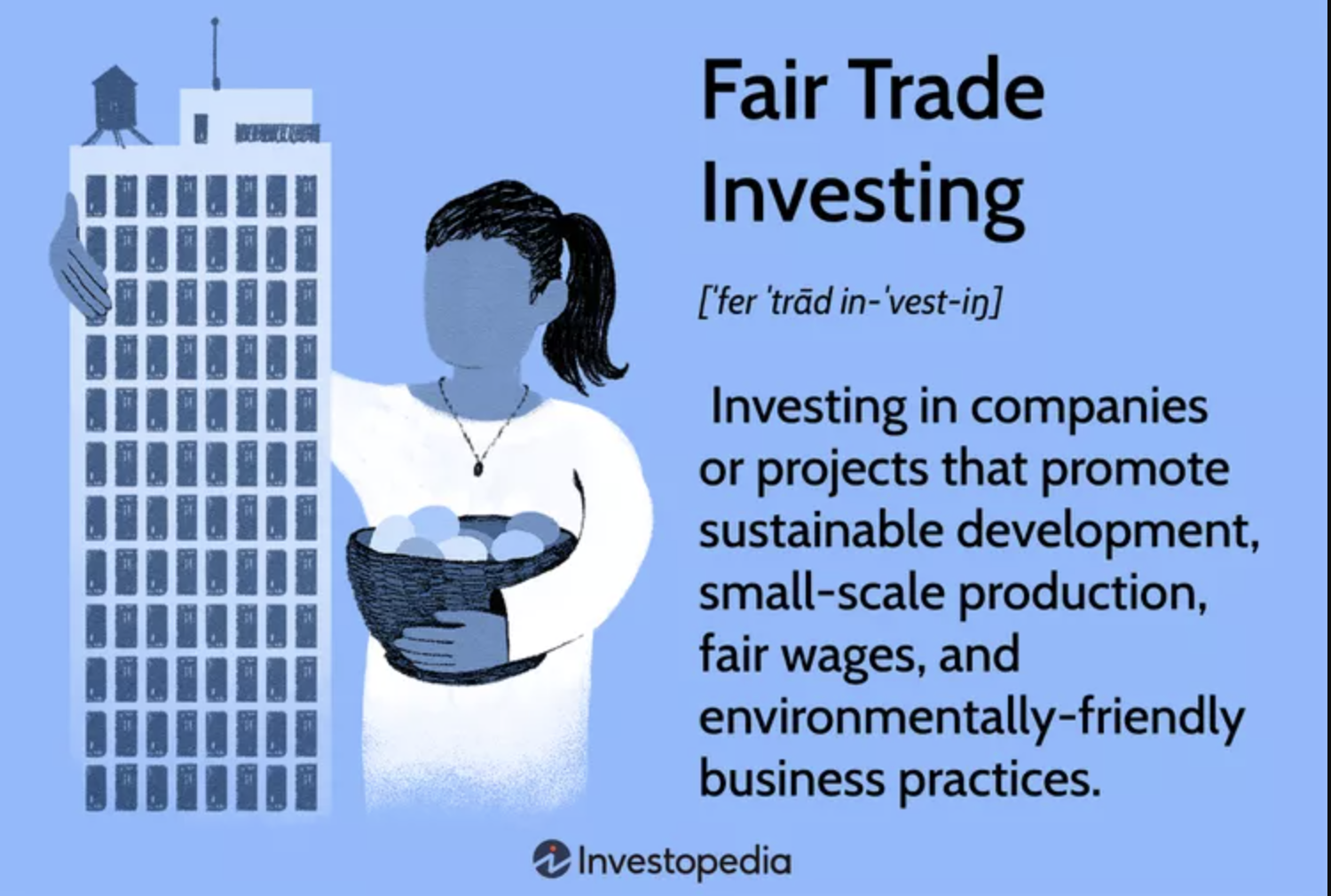 Fair trade investments promote fair trade with producers in developing nations. Basic fair trade philosophies call for a living wage for suppliers of raw goods and materials, as well as respect for strong environmental practices .